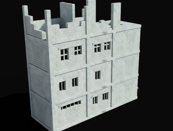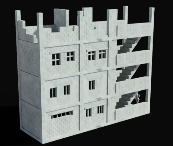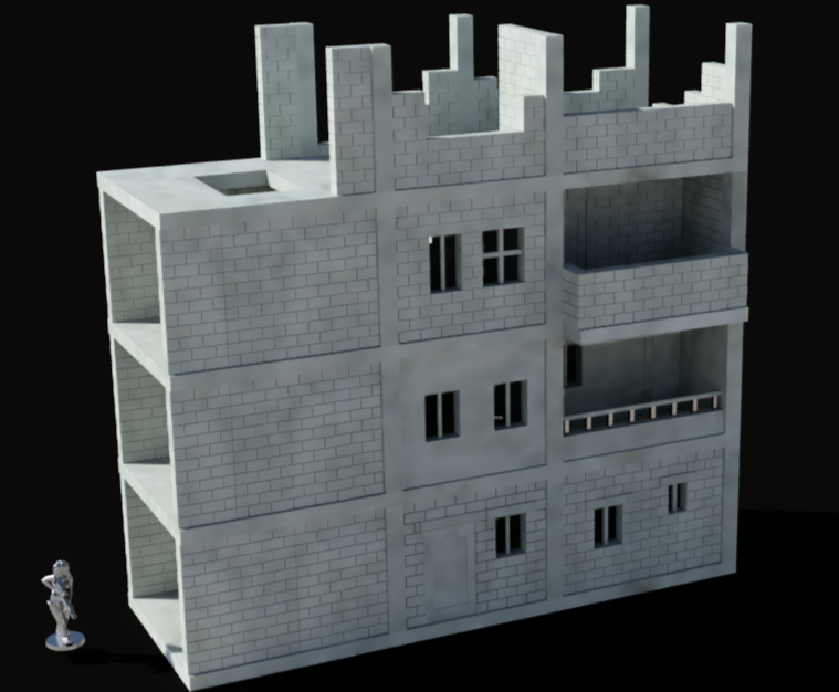 Most shanty/improvised buildings for wargames are designed with corrugated metal sheets as the main construction material. But this does not always reflect reality - in the Middle East, South America and other parts of the world, such buildings tend to be concrete or brick built, using cheap but effective materials. This is a large, multi-storey residential building, with two stairwell options. You could create also two buildings with a stairwell in between.
