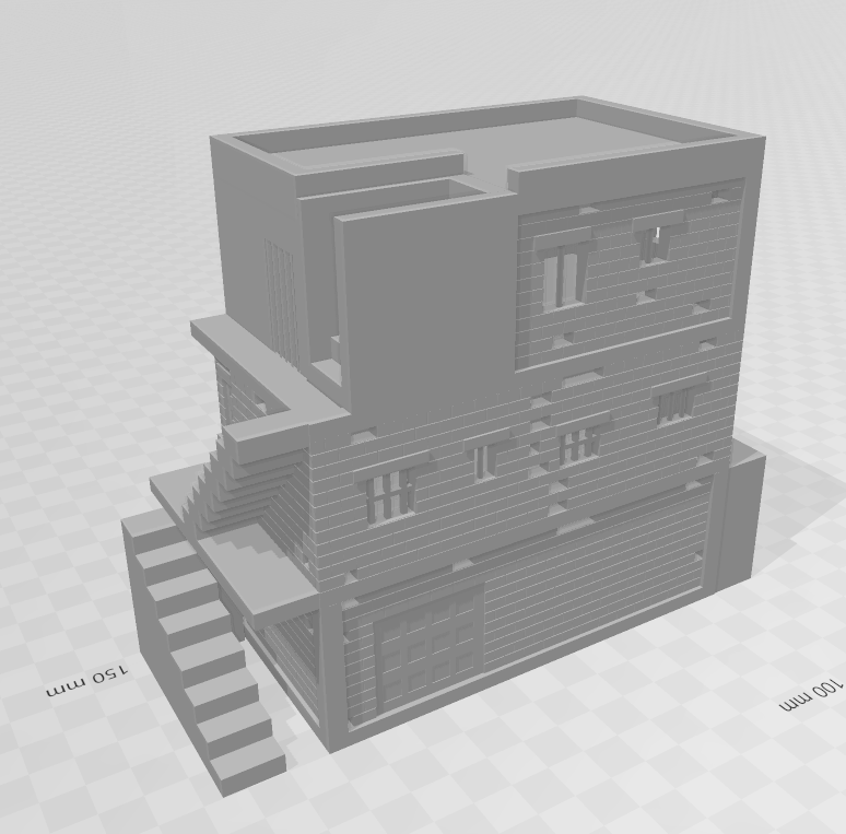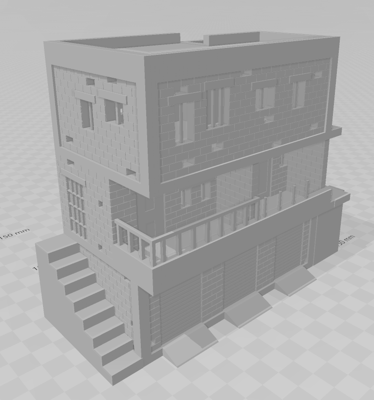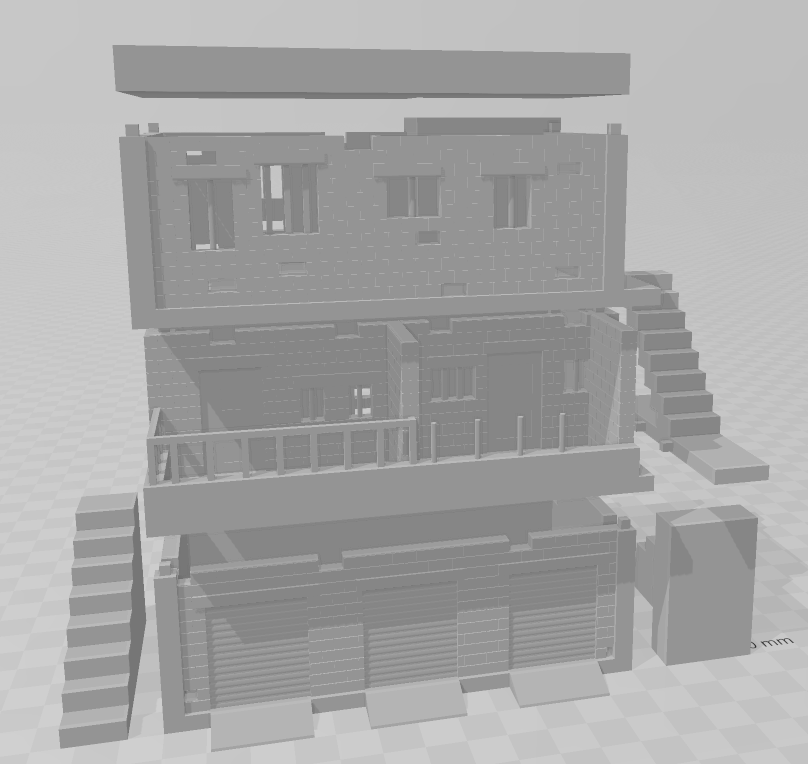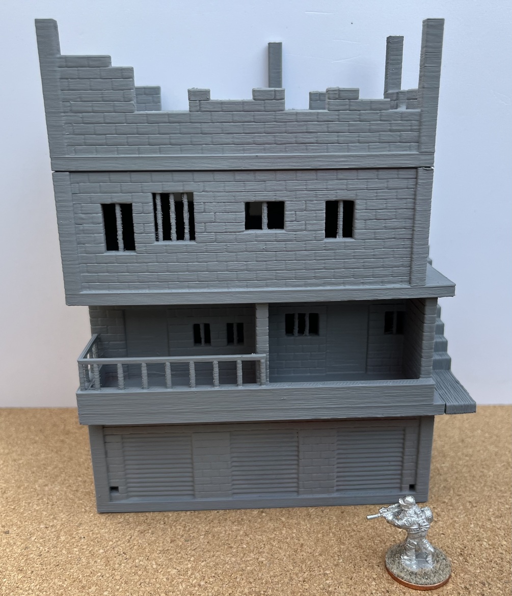 The building can be one, two or three storeys. See sample print pictures at 0.3mm draft resolution (I'm not the best painter!). 20mm metal figue included for presentation/scale only and is copyright Wartime Miniatures.