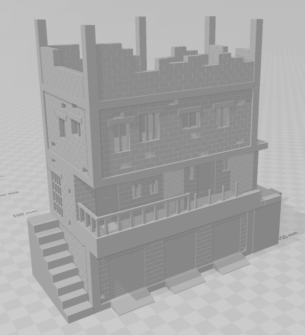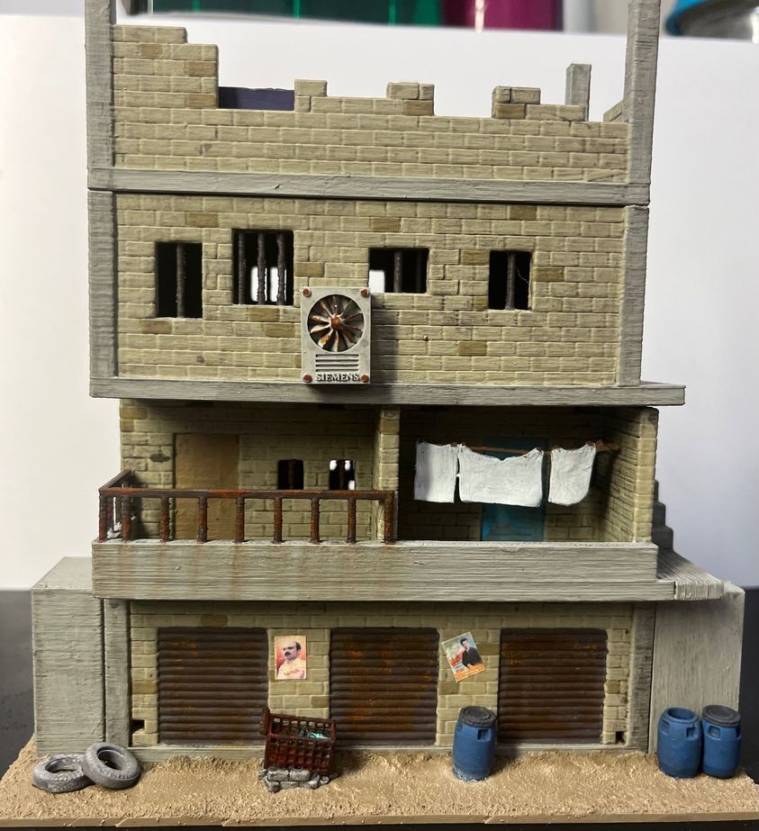Most shanty/improvised buildings for wargames are designed with corrugated metal sheets as the main construction material. But this does not always reflect reality - in the Middle East, South America and other parts of the world, such buildings tend to be concrete or brick built, using cheap but effective materials. This is a large, three storey building, with shops on the ground floor and residential accommodation on the other levels.